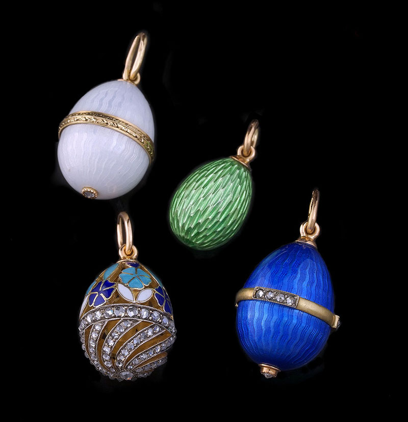 Освоив технику гильоширования, яйца стали напоминать аналоги Фаберже. Прозрачная эмаль, накладные детали, украшенные алмазами, жемчуг, а затем появились и яйца -медальоны, украшенные цветами, корзинками с фруктами, гербами городов России и гербом Российской империи.
