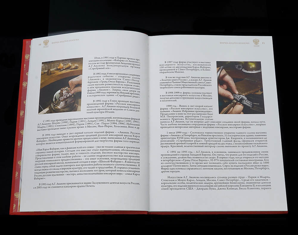 Книга содержит критический анализ художественных особенностей произведений фирмы А.Г.Ананова, краткий обзор творческого пути и историю создания компании. Список мастеров, работавших в фирме в разные годы, фотографии ювелирных произведений фирмы и портреты нынешних работников. Выпущена к 25-летию фирмы.