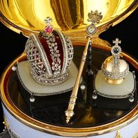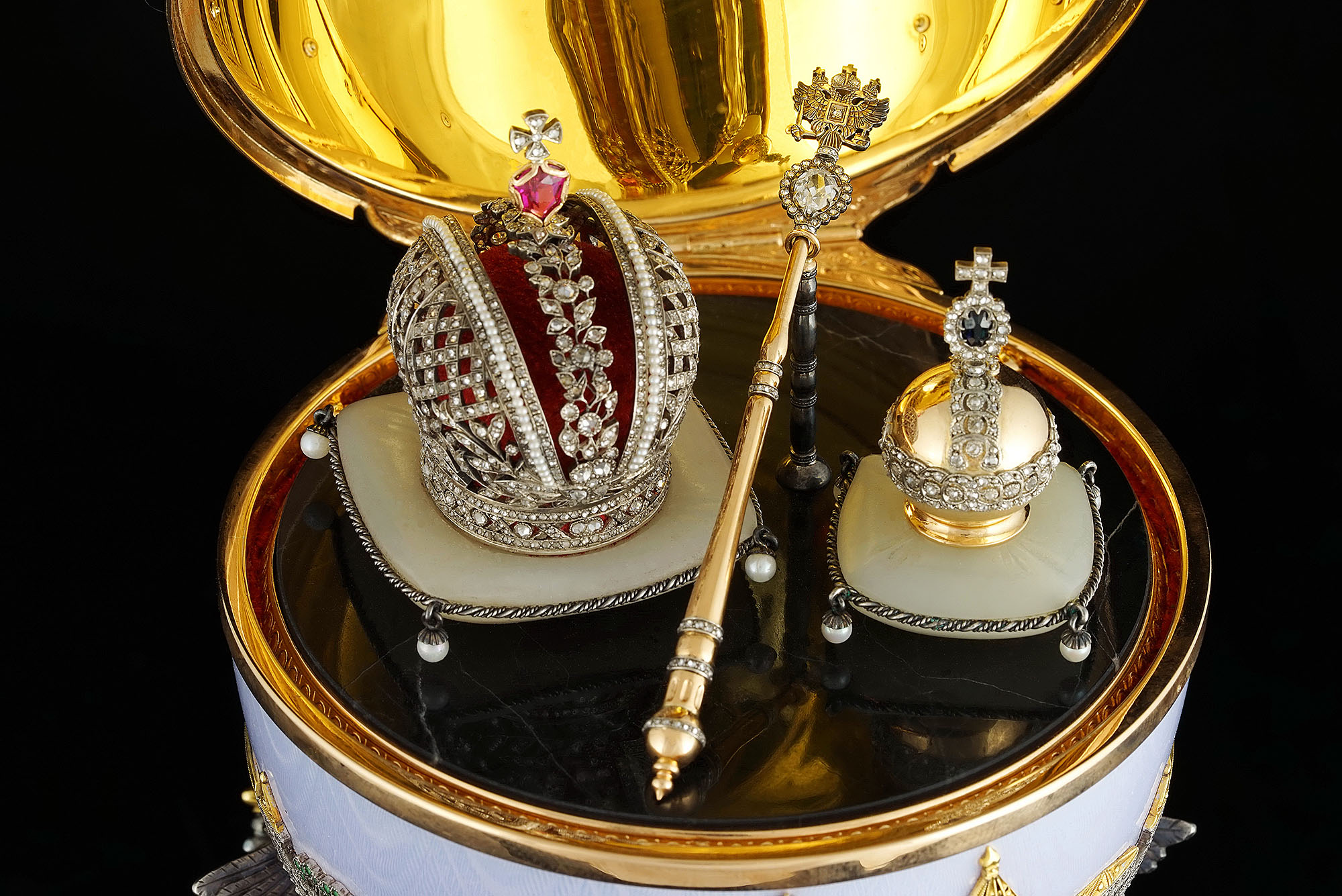 Открыв яйцо, мы видим символы царской власти – корону, скипетр и державу, выполненные из золота, бриллиантов, укрепленные на подушках из белого нефрита, на основании из черной яшмы.