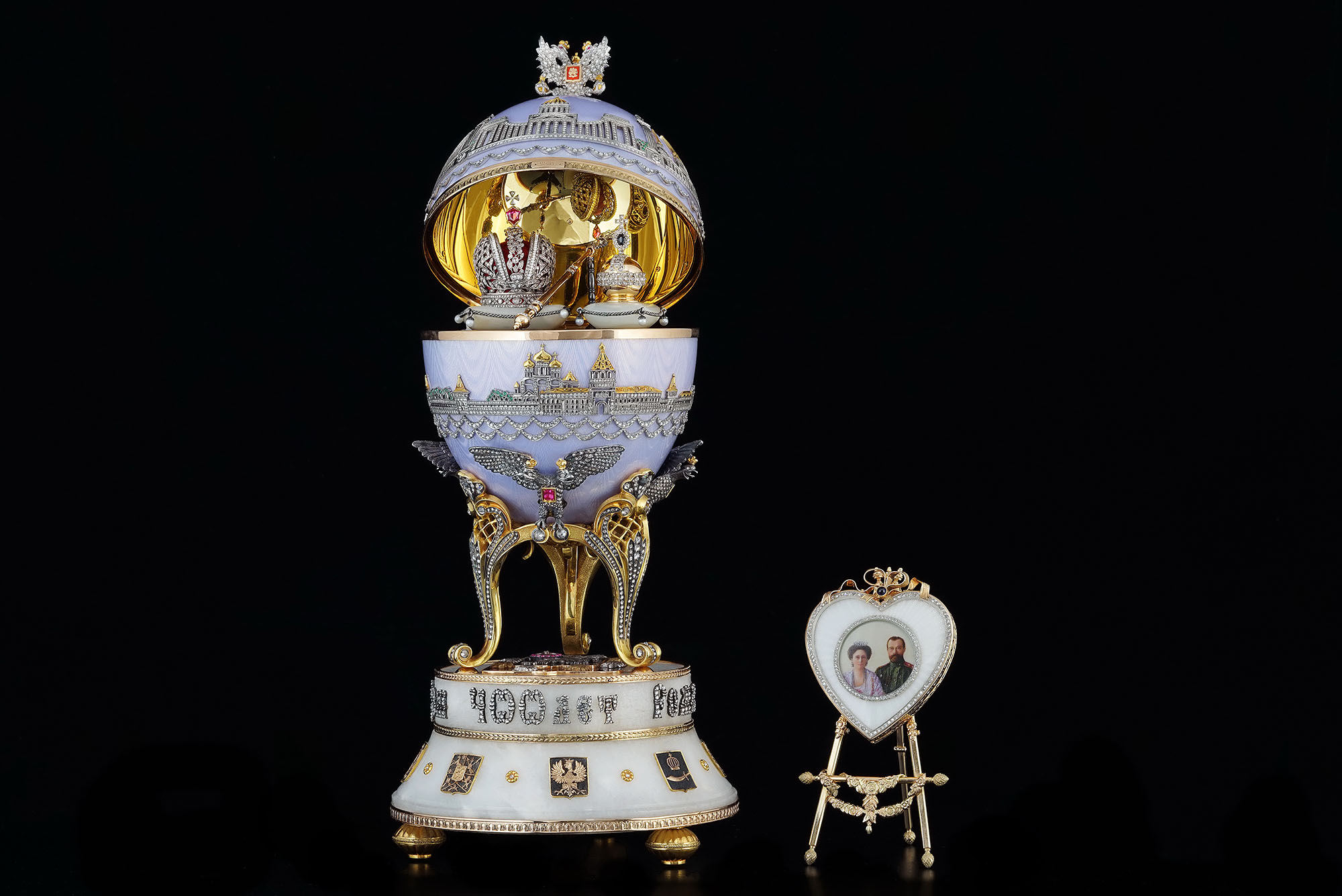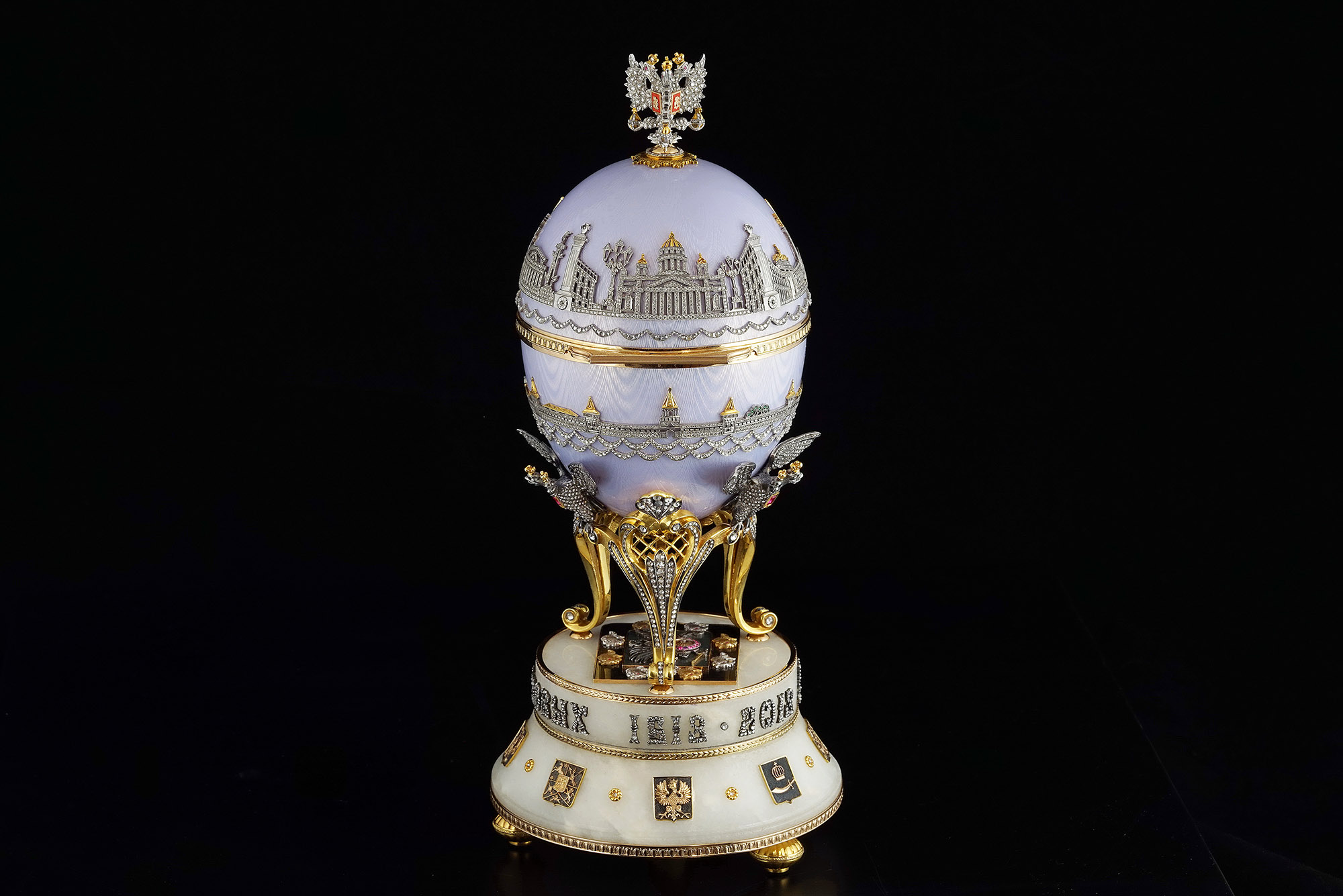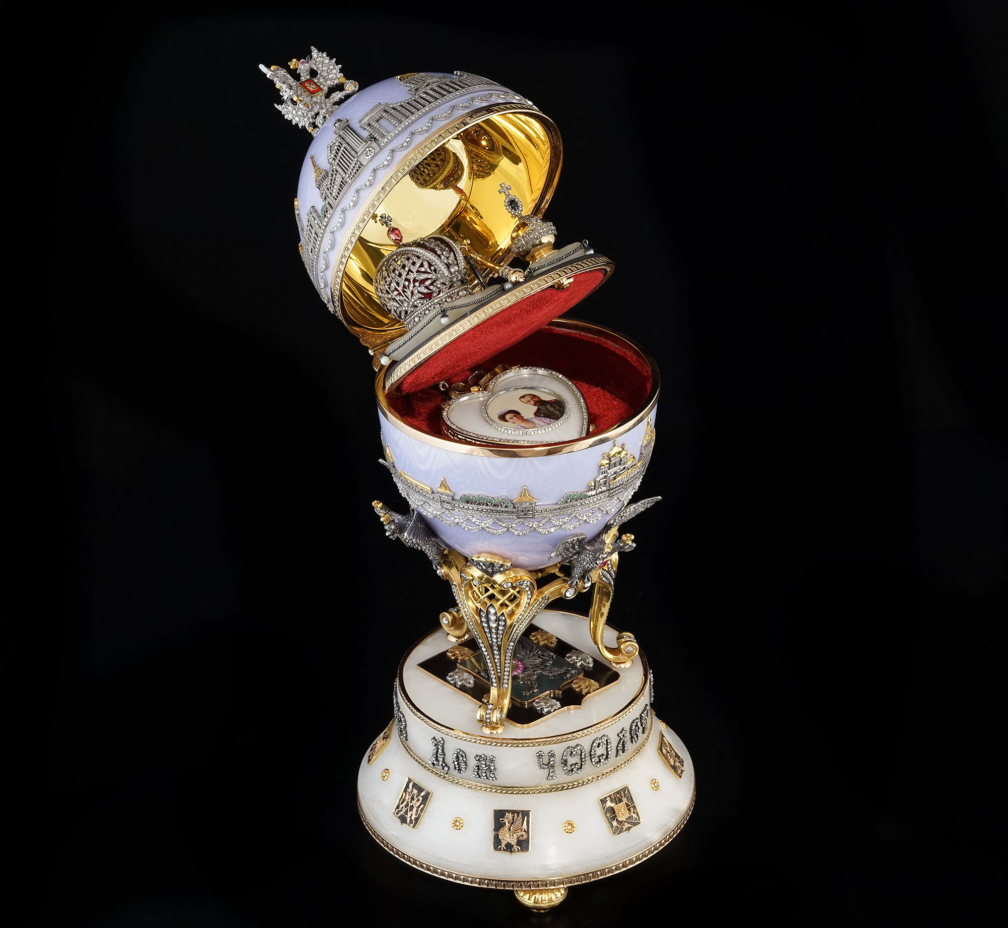 Подставка яйца выполнена из белого мрамора. На подставке – накладная надпись «400 лет Дома Романовых», выполненная из чернёного серебра и бриллиантов, и гербы княжеств России.