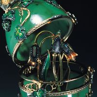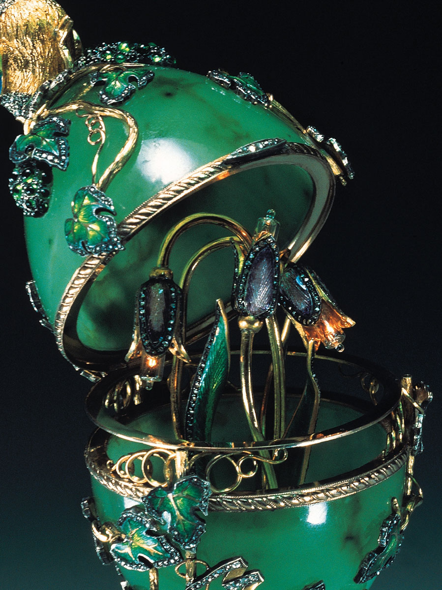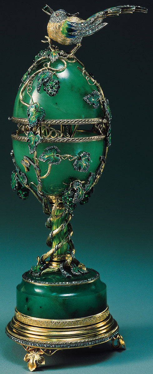 Яйцо и подставка выточены из нефрита. Поверхность яйца покрыта виноградными листьями, отделанными эмалью и изумрудами. Внутри яйца, при нажатии потайной кнопки, загораются лампочки-диоды, вмонтированные в цветы. Венчает яйцо птичка - колибри, держащая в клюве изумруд.