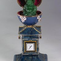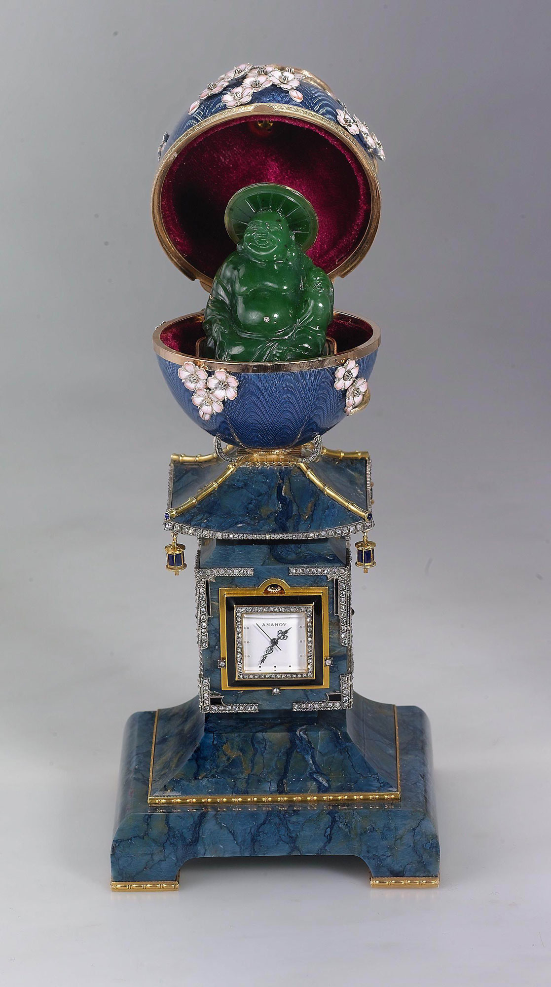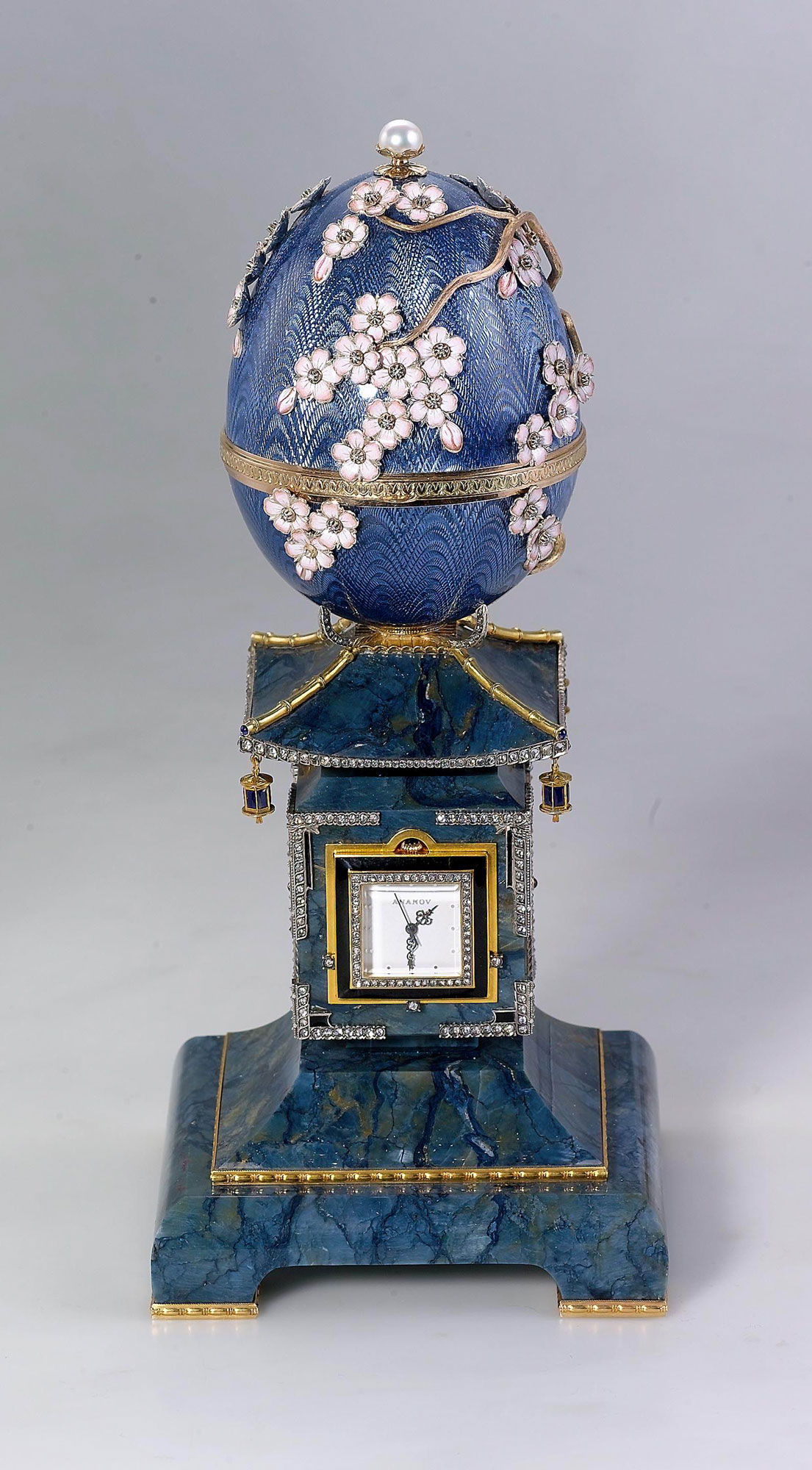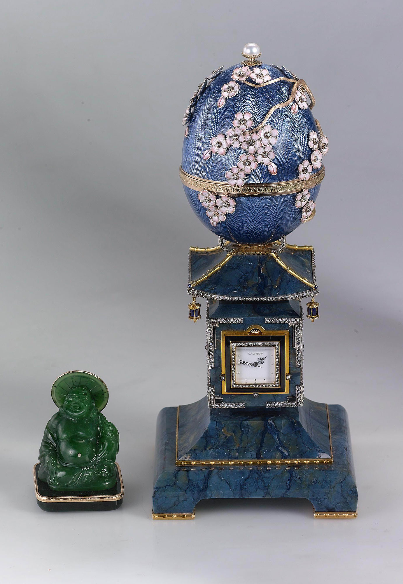 Материалы - золото, бриллианты, жемчуг, прозрачная эмаль по гильошированному фону, нефрит, яшма.