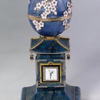 Произведение задумано мастером после посещения садов и парков Японии. Подставка яйца выполнена в форме японского паркового светильника из редкой по тону яшмы. Внутри яйца находится скульптура Бога - покровителя семейного очага, сулящего счастье и благоденствие в доме.