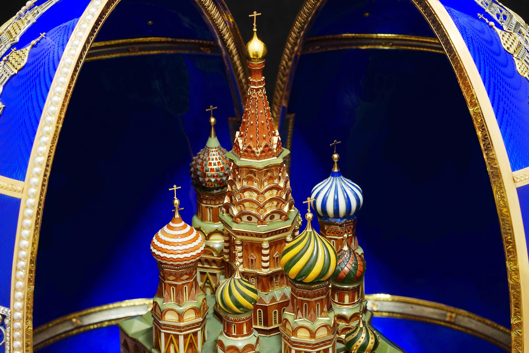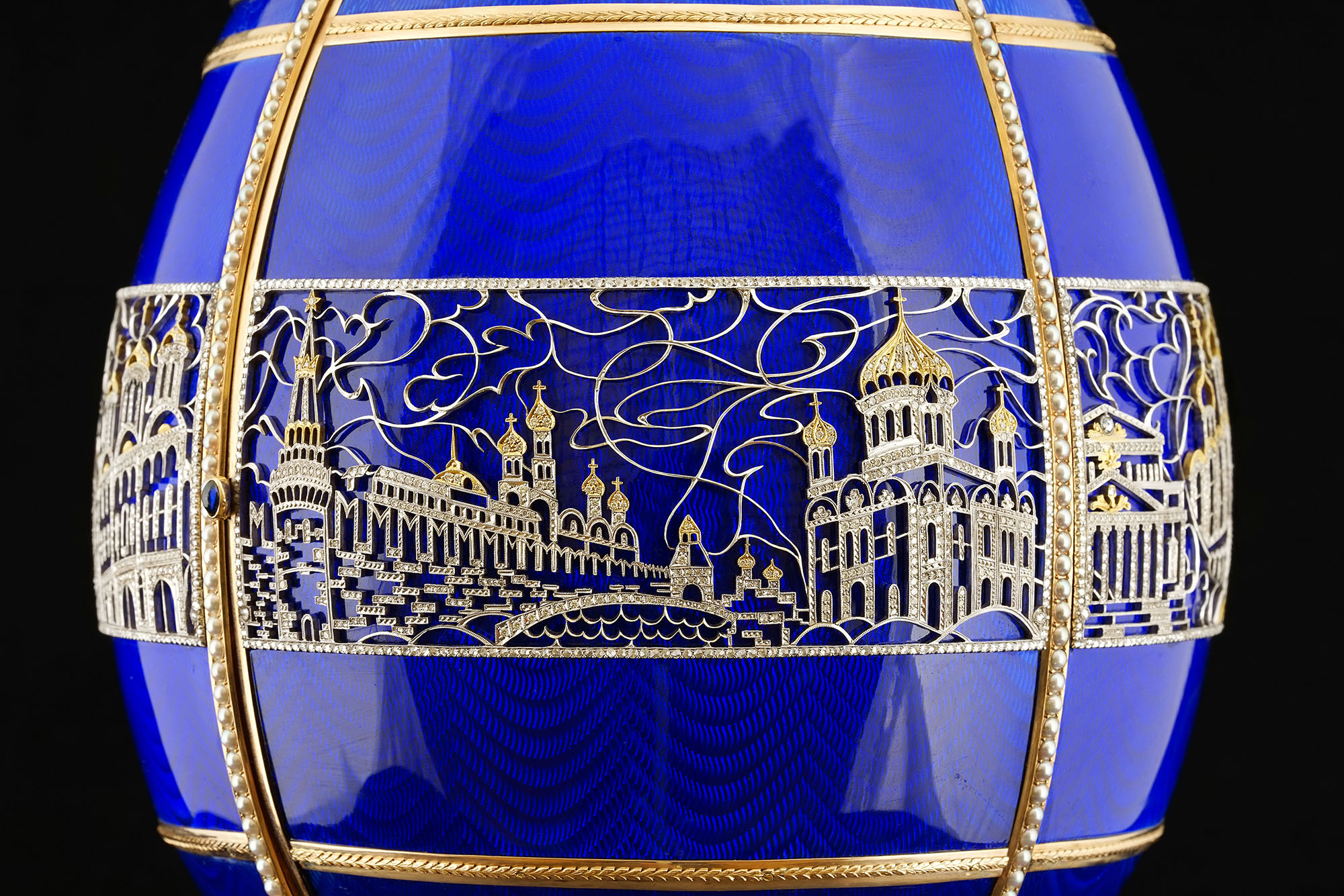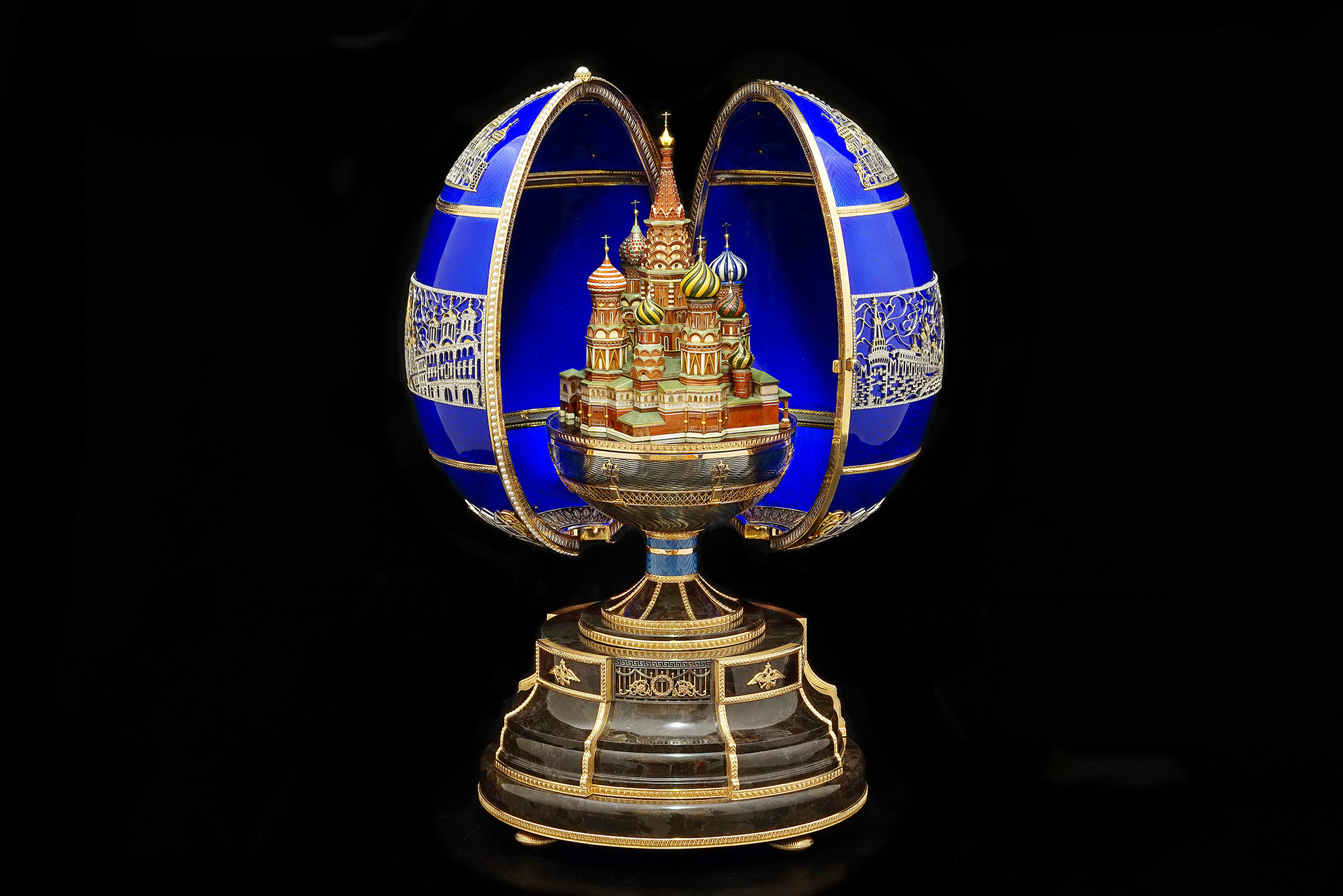 Над созданием этого произведения ювелиры мастерской трудились несколько лет. Работа началась в 1998 году, с решения первой проблемы - яйца столь больших размеров ранее не создавались. Сложным оказалось конструирование механизма, позволяющего открывать яйцо на единственном шарнире, расположенном на задней части яйца вертикально. Создание самого Храма, из яшмы, кахолонга, лазурита, нефрита и большого количества мелких поделочных камней, золота и эмали, так же заняло больше года. В итоге, из-за большого количества заказов, работа над этим произведением была приостановлена, и продолжена только в 2012 году а окончена в 2015. Впервые Пасхальное яйцо из серии "Великие храмы России" продемонстрировано на персональной выставке А.Г. Ананова в Историческом музее Москвы, в августе 2015 года. Над созданием произведения трудились ювелиры Н.Давыдов, Ю.Артамонов, А.Никишов, И. Максимова и др. Идея, дизайн и техническое руководство - А.Г. Ананов
