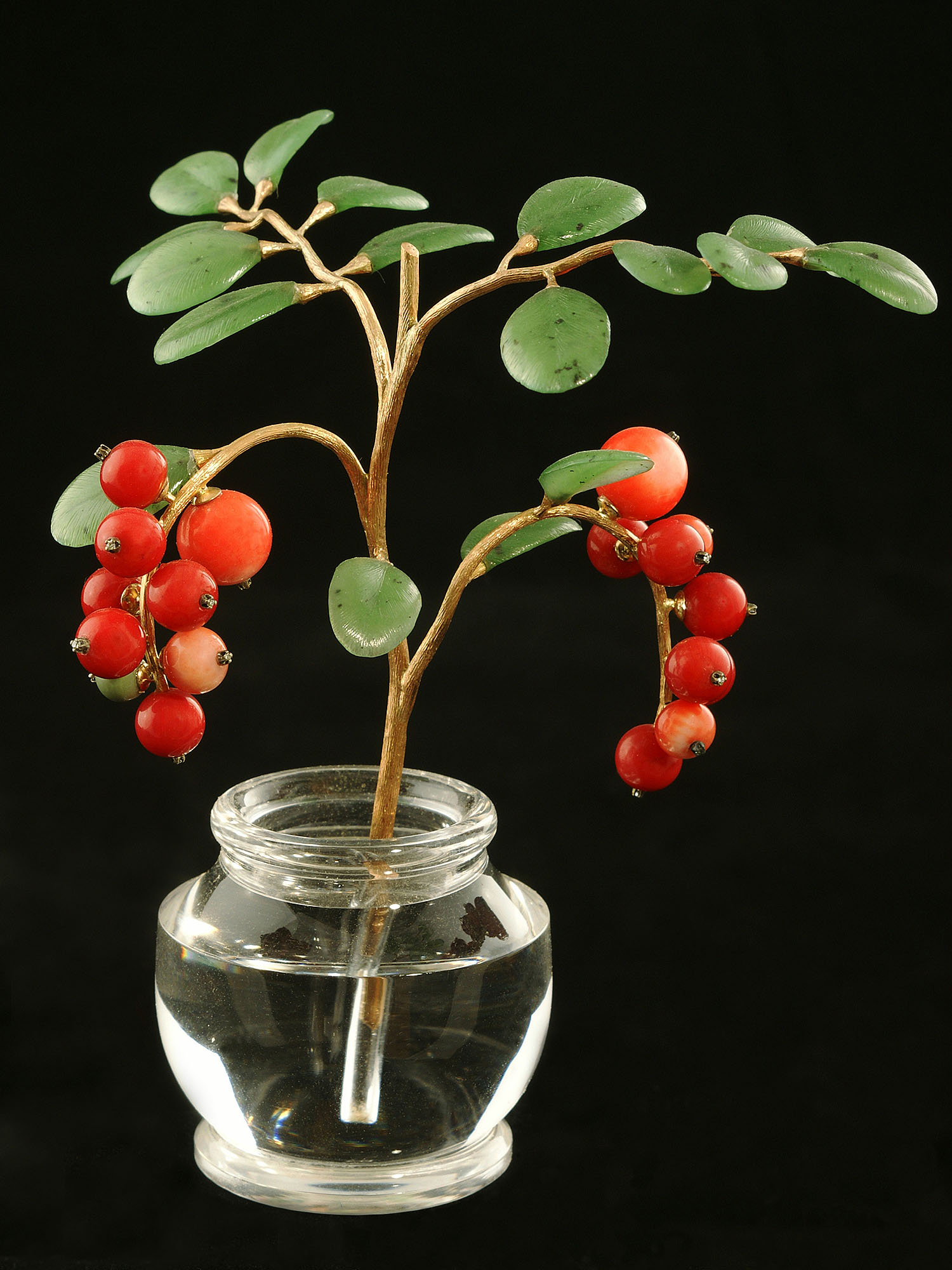 Материалы: золото, серебро, позолота, белые сапфиры, нефрит, коралл, горный хрусталь